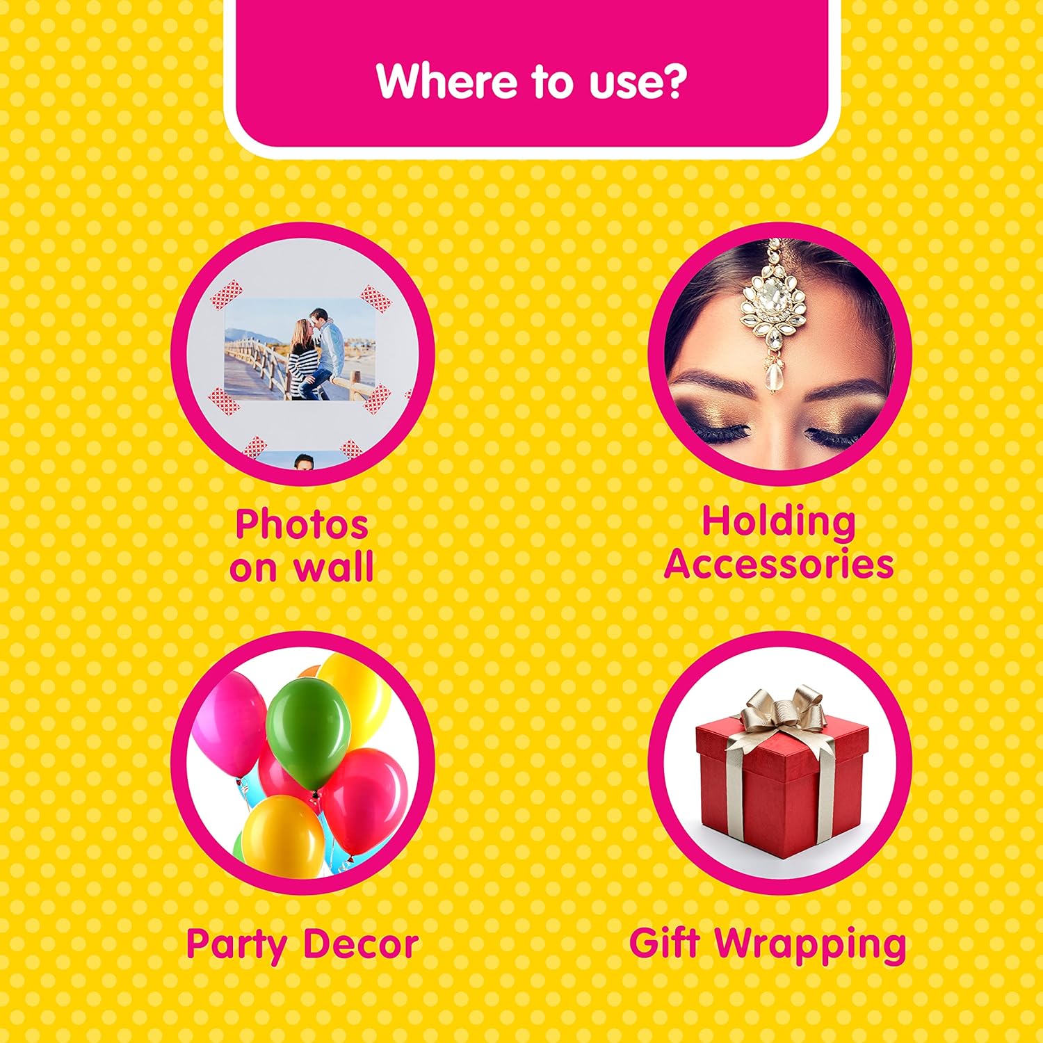 - To stick balloons/ party décor, gift wrapping, school projects, crafting